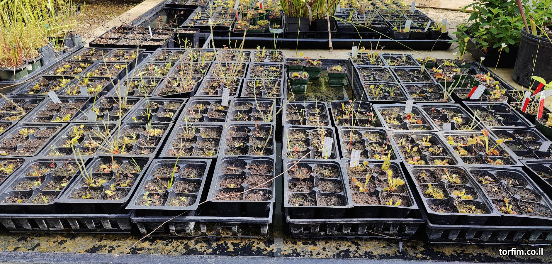 את הצמחים הם מנביטים מזרעים (ריבוי מיני) ומגדלים במגשי הנבטה. רבים מהזרעים הם תוצר של הפריה טבעית על ידי חרקים בשטחי הגן. הטבע באזור מאפשר לגן לגדל את הצמחים הצעירים בחוץ, תחת כיפת השמיים, כאשר בחורף מגנים עליהם מפני נזקי מזג אוויר. חלק מהצמחים מיועד למכירה, כאשר חלק אחר מיועד להמשך קיום האוסף. אפשר לראות בתמונה נביטה של צמחים נוספים במקביל לצמח הטורף – הגן לא מדלל או מנקה צמחים אלו. זה חלק מהמגוון הבוטאני המלווה את הצמח הטורף.